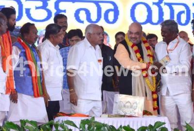 Photo Caption : BJP National President Amit Shah being felicitated by BS Yeddyurappa, Karnataka BJP State President, KS Eshwarappa, Jagadish Shettar and others during the Parivartana Yatra at Holalkere, near Chitradurga, on Wednesday 10th January 2018