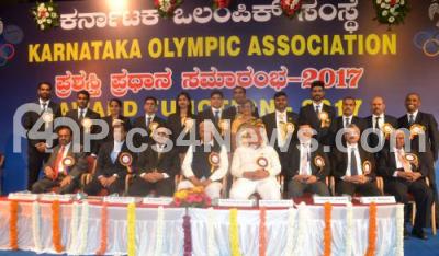 Event Description : Minister Ramalinga Reddy with Governor Vajubhai Vala and others presented Karnataka Olympic Awards 2017 to athletes and personalities from different fields and different sports at Yavanika, in Bengaluru on Thursday 11th January 2018