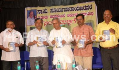 Photo Caption : KS Nagaraj with R Chandrashekhar, CV Shivashankar and others releasing the book “Sanje Mallige†at BM Shree Kala Bhavan, NR Colony, in Bengaluru on Saturday 13th January 2018