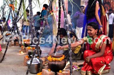 Event Description : Residents of Sudham Nagar preparing Pongal during Sankranti festival celebrations, in Bengaluru on Sunday 14th January 2018