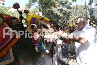 Event Description : BJP State President B S Yeddyurappa performing pooja to cattle to celebrate Sankranti festival at his residence, in Bengaluru on Monday 15th January 2018