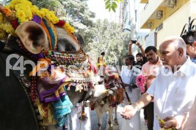 BJP State President B S Yeddyurappa performing pooja to cattle to celebrate Sankranti festival at his residence, in Bengaluru on Monday 15th January 2018