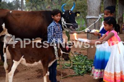 Girls offering pooja to the cattles on the occasion of Sankranti Festival at Kengeri, in Bengaluru on Monday 15th January 2018