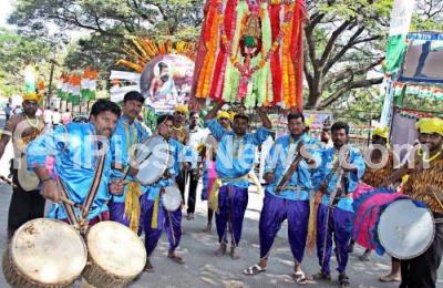 Photo Caption : Folk artistes performing dance on the occasion of Thiruvalluvar Jayanthi celebrations at Ulsoor, in Bengaluru on Monday 15th January 2018