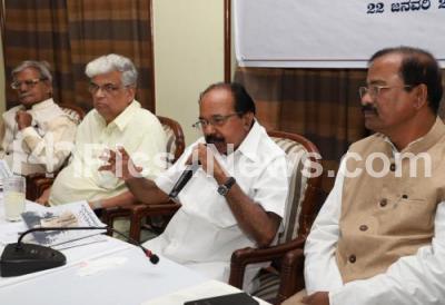 Photo Caption : Dr M Veerappa Moily, Former CM and Senior Congress leader with Prof Mallepuram G Venkatesh, Prof Radhakrishna and others addressing the press conference after releasing the introduction epic “Sri Bahubali Ahimsadigvijayamâ€, and the main edition of the epic would be released on 24th January 2018 at Shravanabelagola, the press conference was held at Hotel Chancery, in Bengaluru on Monday 22nd January 2018