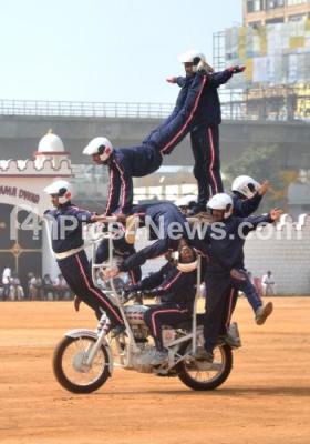 Photo Caption : Army personnel performing bike stunts rehearsal for the Republic Day parade at Manekshaw Parade Grounds, in Bengaluru on Tuesday 23rd January 2018