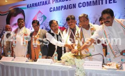 Photo Caption : CM Siddaramaiah with KC Venugopal, Karnataka In Charge, Dr G Parameshwar, Minister DK Shivakumar and other congress leaders inaugurated the KPCC Campaign Committee Meeting at Hotel Chancery Pavilion, in Bengaluru on Wednesday 31st January 2018
