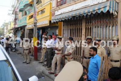 Photo Caption : Tight police security and shops were shut down after, Santhosh, 28 year old BJP worker, who was stabbed to death by a group of four people last night in JC Nagar, Chinnappa Garden in North Bengaluru, in Bengaluru on Thursday 1st February 2018