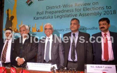 Photo Caption : Chief Election Commissioner, Om Prakash Rawat with Election Commissioners Sunil Arora and Ashok Lavasa and other election officials seen during the press conference to review poll preparedness for elections to Karnataka Legislative Assembly 2018 at Vikasa Soudha, in Bengaluru on Thursday 1st February 2018