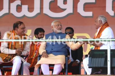 Photo Caption : PM Narendra Modi seen with BS Yeddyurappa, Ananth Kumar, Union Minister at the valedictory of BJP Parivartana Rally at Palace Grounds, in Bengaluru on Sunday 4th February 2018