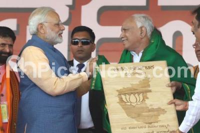 BJP State President BS Yeddyurappa being felicitated by PM Narendra Modi during the valedictory of BJP Parivartana Rally at Palace Grounds, in Bengaluru on Sunday 4th February 2018