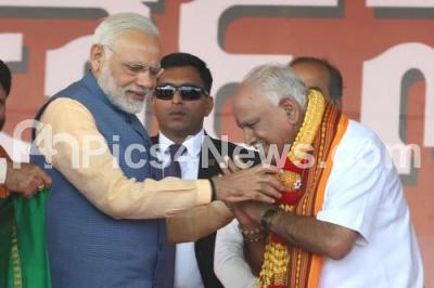 Photo Caption : BJP State President BS Yeddyurappa being felicitated by PM Narendra Modi during the valedictory of BJP Parivartana Rally at Palace Grounds, in Bengaluru on Sunday 4th February 2018