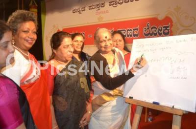 Photo Caption : Dr Vijaya with Jija Hari Singh, Dr Vasundhara Bhupathi and others at the signature campaign during the Desi Kumata Loka Kannada Loka program at Nayana, in Bengaluru on Monday 5th February 2018