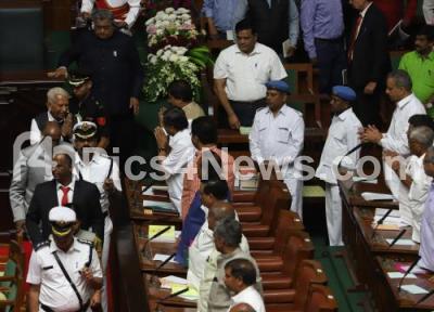 Photo Caption : Governor Vajubhai Vala being greeted by Opposition party leaders after addressing the Joint Session speech at Vidhan Soudha, in Bengaluru on Monday 5th February 2018