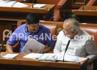 Photo Caption : Home Minister Ramalinga Reddy and BJP MLA Narayanswamy during Assembly session at Vidhana Soudha, in Bengaluru on Tuesday 6th February 2018