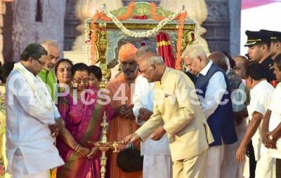President of India Ram Nath Kovind and his wife Savita, Chief Minister of Karnataka Siddaramaiah, Governor of Karnataka Vajubai Vala, Dr. Veerehendra Hegde of Dharmadikari of Dharmastala, Chaurkeerti Bhattaraka Mahaswamiji of Shravana Belagola and Minister for Animal Husbandry, Fisheries Department GoK A Manju at the inauguration of “Mahamastakabhisheka Mahotsava 2018 of Gommateshwara Bhagavan Sri Bhaubali Swami” at Shravanabelagola in Hassan District, on Wednesday 7th February 2018