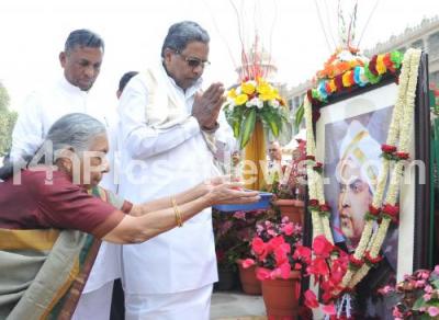 Photo Caption : CM Siddaramaiah with Vijaylakshmi Thimmaiah, daughter of former Chief Minister Kengal Hanumanthaiya, tribute to the portrait of former Chief Minister Kengal Hanumanthaiya, on his 110th birth anniversary at Vidhan Soudha, in Bengaluru on Saturday 10th February 2018