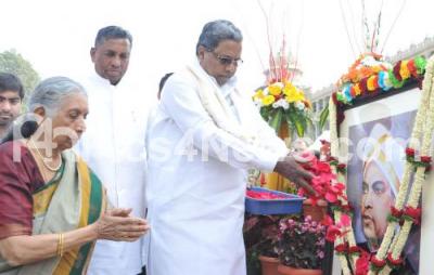 CM Siddaramaiah with Vijaylakshmi Thimmaiah, daughter of former Chief Minister Kengal Hanumanthaiya, tribute to the portrait of former Chief Minister Kengal Hanumanthaiya, on his 110th birth anniversary at Vidhan Soudha, in Bengaluru on Saturday 10th February 2018
