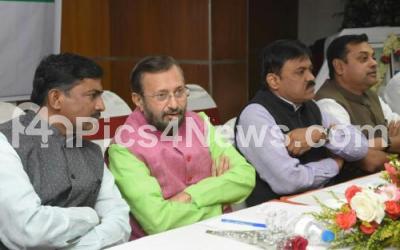Photo Caption : Union Minister Prakash Javadekar with BJP Leaders Muralidhar Rao, Sambit Patra, G V L Narasimha Rao and others at the inauguration of BJP State Media Cell Workshop at hotel Citadel, in Bengaluru on Sunday 11th February 2018