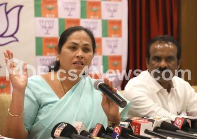 Photo Caption : BJP MP Shobha Karandlaje addressing press conference with BJP Leader N Ravikumar at Hotel Parag, in Bengaluru on Wednesday 14th February 2018