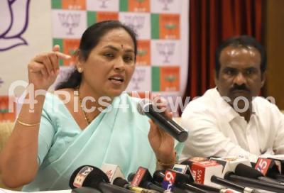 Photo Caption : BJP MP Shobha Karandlaje addressing press conference with BJP Leader N Ravikumar at Hotel Parag, in Bengaluru on Wednesday 14th February 2018