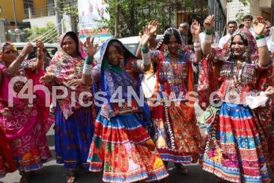 Photo Caption : Banjara community women dancing during 279th jayantotsava of Santa Sevalal at BJP office, in Bengaluru on Thursday 15th February 2018