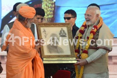 Photo Caption : Prime Minster of India Narendra Modi being felicitated by Chaurkeerti Bhattaraka Mahaswamiji of Shravana Belagola during the Mahamastakabisheka of monolithic statue of Lord Bahubali, as the Mahamastakabisheka, the once in 12 years head anointing ceremony of the monolithic statue of Lord Bahubali and inauguration of newly carved 630 steps at Vindhyagiri and Bahubali General hospital, also seen are Governor of Karnataka Vajubhai Vala, Minister A Manju and Union Minister Ananth Kumar, in Channarayapatna, Shravanabelagola, Hassan on Monday 19th February 2018