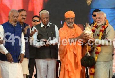 Photo Caption : Prime Minster of India Narendra Modi being felicitated by Chaurkeerti Bhattaraka Mahaswamiji of Shravana Belagola during the Mahamastakabisheka of monolithic statue of Lord Bahubali, as the Mahamastakabisheka, the once in 12 years head anointing ceremony of the monolithic statue of Lord Bahubali and inauguration of newly carved 630 steps at Vindhyagiri and Bahubali General hospital, also seen are Governor of Karnataka Vajubhai Vala, Minister A Manju and Union Minister Ananth Kumar, in Channarayapatna, Shravanabelagola, Hassan on Monday 19th February 2018