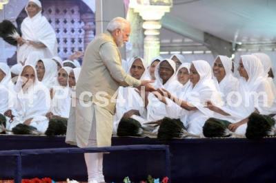 Photo Caption : Prime Minster of India Narendra Modi interacting with Jain Sadvi during the Mahamastakabisheka of monolithic statue of Lord Bahubali, as the Mahamastakabisheka, the once in 12 years head anointing ceremony of the monolithic statue of Lord Bahubali and inauguration of newly carved 630 steps at Vindhyagiri and Bahubali General hospital, in Channarayapatna, Shravanabelagola, Hassan on Monday 19th February 2018
