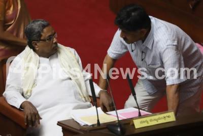Photo Caption : CM Siddaramaiah seen in a conversation with Minister DK Shivakumar during the Council Session at Vidhan Soudha, in Bengaluru on Tuesday 20th February 2018