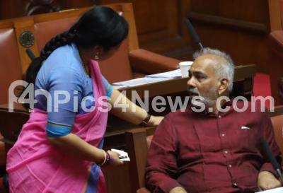 Photo Caption : MLC Tara in conversation with Minister A Manju during the Council Session at Vidhan Soudha, in Bengaluru on Tuesday 20th February 2018