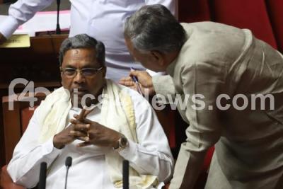 Photo Caption : CM Siddaramaiah in conversation with JDS MLC Basavaraj Horatti during the Council Session at Vidhan Soudha, in Bengaluru on Tuesday 20th February 2018