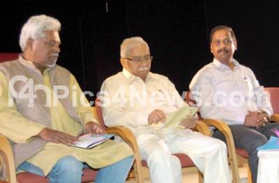Dr Chandrashekar Kambara, Jnanapeeata awardee, Chairman , Central Sahitya Academi with N R Vishukumar,Director, Kannada and Culture Dept and C Basavalingaiah, Director, National Drama School Bangalore Centre at the inauguration of 8th Theatre Olympics at Ravindra Kalakshetra, in Bengaluru on Tuesday 20th February 2018