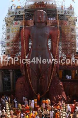 Event Description : Jalabhisheka and Panchamrutabisheka on monolithic statue of Lord Bahubali during Mahamastakabisheka of monolithic statue of Lord Bahubali, as the Mahamastakabisheka, the once in 12 years head anointing ceremony of the monolithic statue of Lord Bahubali , in Channarayapatna, Shravanabelagola, Hassan on Tuesday 20th February 2018