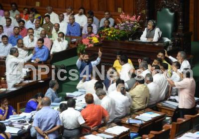 Photo Caption : BJP opposition party seen protesting during CM Siddaramaiah speech at the Assembly Session at Vidhana Soudha, in Bengaluru on Friday 23rd February 2018