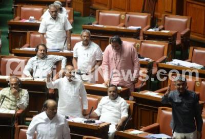 Photo Caption : Ruling Party MLAs seen arguing with the opposition during the Assembly Session at Vidhana Soudha, in Bengaluru on Friday 23rd February 2018