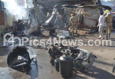 Photo Caption : Cylinder blast caused fire at a Gas refilling godown at Broadway Road, Shivajinagar, firemen and local residents were seen dousing off the fire caused by the blast, in Bengaluru on Friday 23rd February 2018