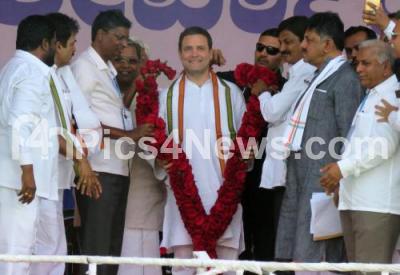 Photo Caption : Congress President Rahul Gandhi being felicitated in the presence of CM Siddaramaiah, Minister DK Shivakumar and others at the Congress Public Meeting at Athani, in Belagavi on Saturday 24th February 2018