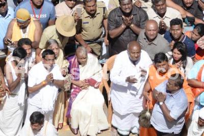 Photo Caption : Former PM and JDS Supremo H D Devegowda, (86 year old) and his wife during Mahamastakabisheka of monolithic statue of Lord Bahubali, as the Mahamastakabisheka, the once in 12 years head anointing ceremony of the monolithic statue of Lord Bahubali, in Channarayapatna, Shravanabelagola, Hassan on Saturday 24th February 2018