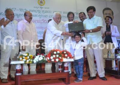 Ministers KJ George, RV Deshpande, Basavaraj Rayareddy, Ramalinga Reddy, TB Jayachandra and others presented free laptops to students of 1st year of all categories studying in Government Degree Colleges and Diploma Institutions at Banquet Hall, Vidhan Soudha, organised by Government of Karnataka, in Bengaluru on Tuesday 27th February 2018