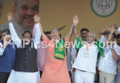 Photo Caption : PM Narendra Modi seen with BS Yeddyurappa, KS Eshwarappa and other BJP leaders at a BJP Rally for upcoming Karnataka Assembly Elections at Davanagere on Tuesday 27th February 2018