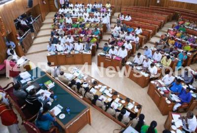 Photo Caption : Mahadev, BBMP Taxation and Finance Committee Chairman with Mayor Sampath Raj, Deputy Mayor Padmavathi Narasimhamurthy , Manjunath Prasad, BBMP Commissioner addressing the BBMP Budget Session at Council Hall at BBMP Office, in Bengaluru on Wednesday 28th February 2018
