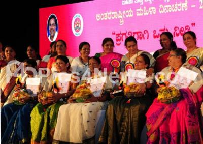 Photo Caption : Minister Umashree presented Kittur Rani Chennamma award to women achievers during the International Womens Day program at Ravindra Kalakshetra, in Bengaluru on Thursday 8th March 2018