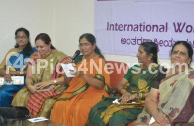 Photo Caption : Women writers MR Kamala, K Sharifa, Kala GK, Anbuselvi and Rajeshwari Diwakarla seen at the Literary Forum “Narichetna†on the occasion of International Womens Day at Conference Hall, Sahitya Academi, Central College, in Bengaluru on Thursday 8th March 2018