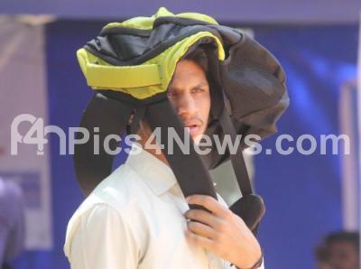 Photo Caption : Student covering his head with the bag to protect from the sun at Basavanagudi, as heat waves are increasing every passing day, in Bengaluru on Friday 9th March 2018