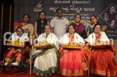 Eminent singers, Shyamala G Bhave, HR Leelavathi, Jayashree Arvind and Indu Vishwanath being felicitated by members of Hambaale Parthibharanga and Kannada and Culture Dept on the occasion of International Womens Day at Nayana, in Bengaluru on Sunday 11th March 2018