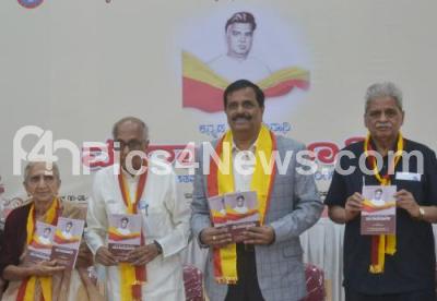 Photo Caption : Dr Manu Baligar, President Kannada Sahitya Parishat, with Kamalamma Ramamurthy, Wife of Ma Ramamurthy ( nicknamed “Kannadada Veera Senani†and Designed the Karnataka Flag), Dr M Chidanandamurthy and others releasing the book on Ma Ramamurthy at Kannada Sahitya Parishat, in Bengaluru on Sunday 11th March 2018