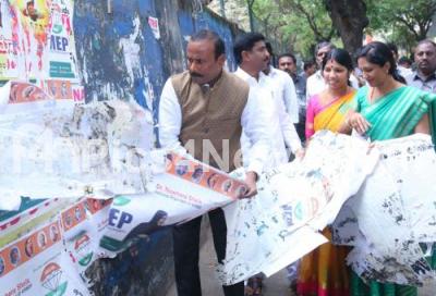 Photo Caption : BBMP Mayor Sampath Raj with Deputy Mayor Padmavati and others seen removing the illegal wall posters and banners at Minerva Circle, in Bengaluru on Friday 16th March 2018