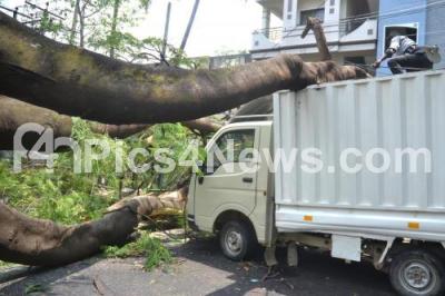 Photo Caption : Tree uprooted on the road at Hombegowda Nagar due to last night heavy rainfall, in Bengaluru on Saturday 17th March 2018