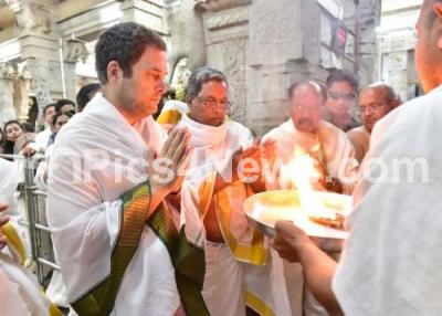 Event Description : AICC President Rahul Gandhi offered pooja at Sringeri Sharada during Congress “Janashirvada Rally”, also seen are Chief Minister of Karnataka Siddaramaiah and K C Venugopal, Karnataka In charge, in Sringeri on Wednesday 21st March 2018